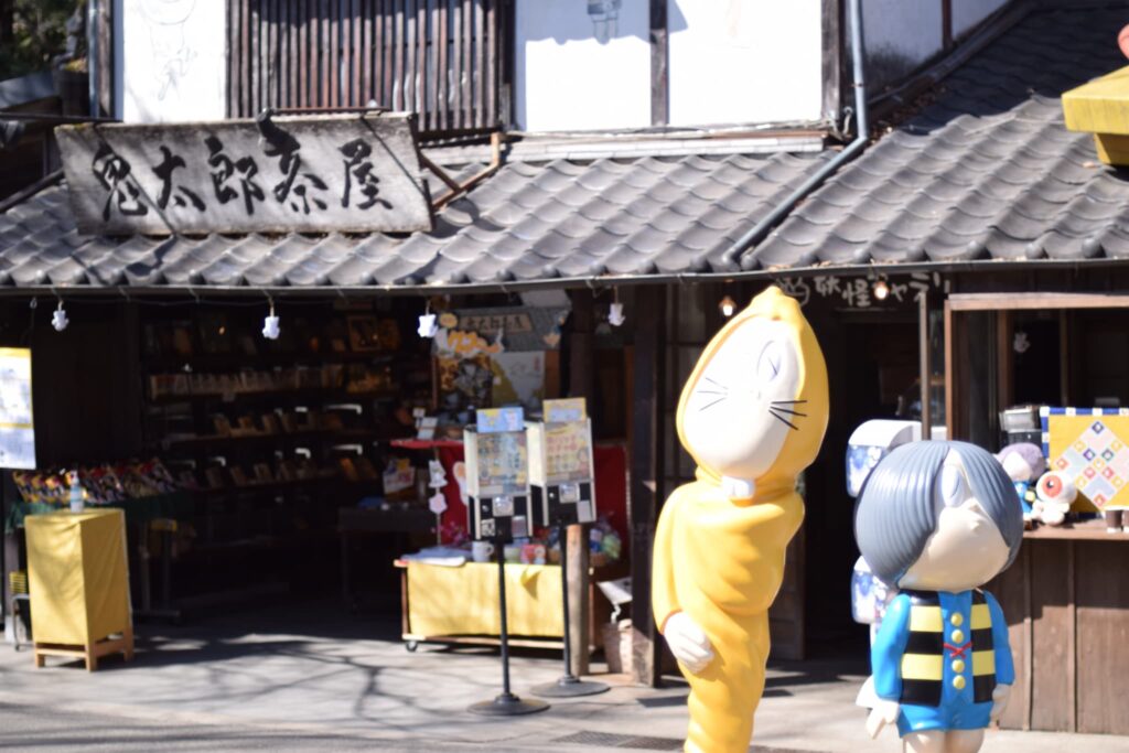 参道には鬼太郎茶屋など食べ物屋さんが多く立ち並ぶだけでなく、昔ながらのおもちゃが置いてあるお土産屋さんもたくさんあります。